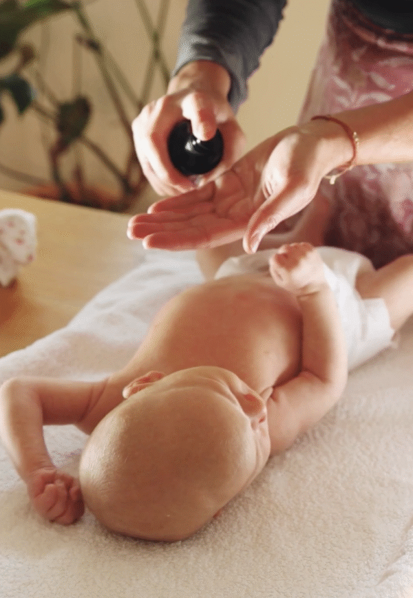 Dispense 3 (or more, depending on your baby’s needs) pumps of our baby massage oil onto the palm of your hand, and begin to gently rub the oil into your baby’s skin using circular motions.